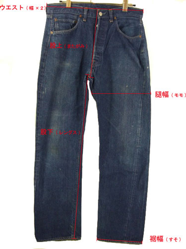 【ウエスト】 ファスナーやボタンを閉じ、上端を直線に計測した長さを2倍したもの 【股上】 フロントの股の縫い目~ウエストまでの長さ 【股下】 内股合わせから裾までを軽くひっぱり計測した直線の長さ。