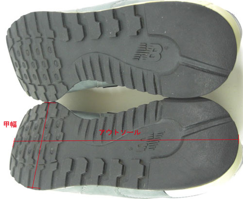 【アウトソール】 ソール裏 つま先~カカトの直線の長さ。 【甲幅】 ソール裏の一番広い直線の長さ。